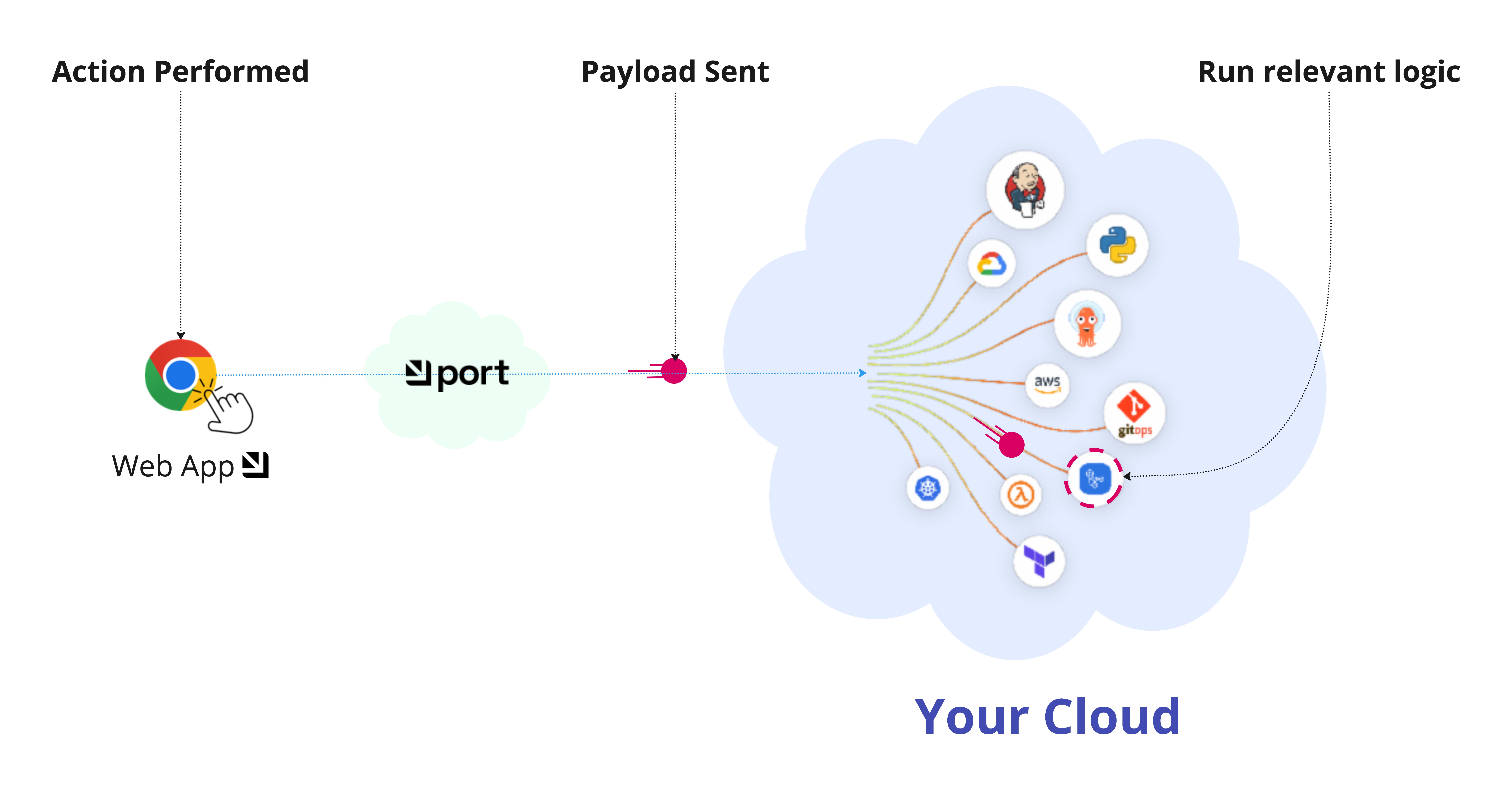 - A pre-defined payload containing any desired metadata about the action and its inputs is sent to your infrastructure.
