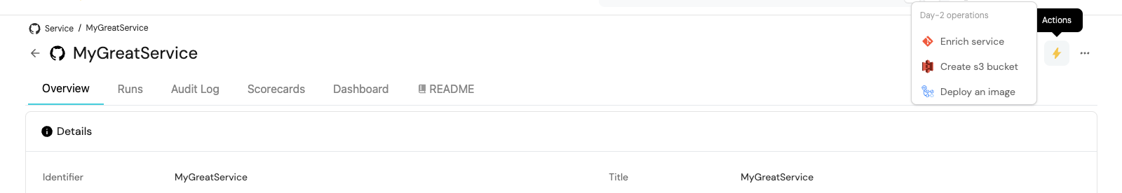 Actions are executable pieces of logic that either developers or AI agents can run. They drive developer productivity by enabling them to use actions like scaffolding a service or provisioning a cloud resource.