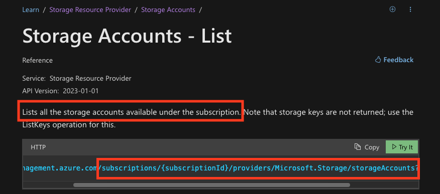 apiVersionfield is the Azure API version to use to fetch the resource. This field is required for all resources. For example, the API versions for thestorageAccountresource was found in the Storage Account Rest APIapiVersion: "2023-01-01"