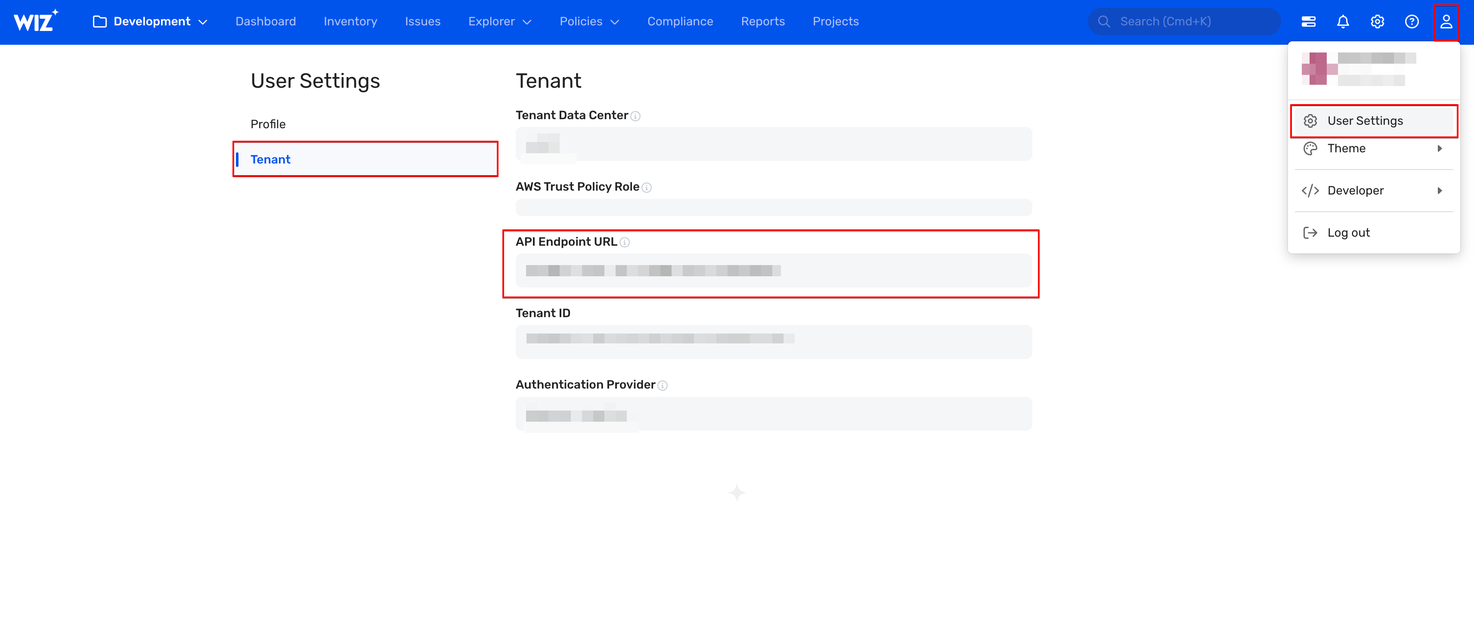 - Copy and save the API URL to use while configuring the Wiz integration.