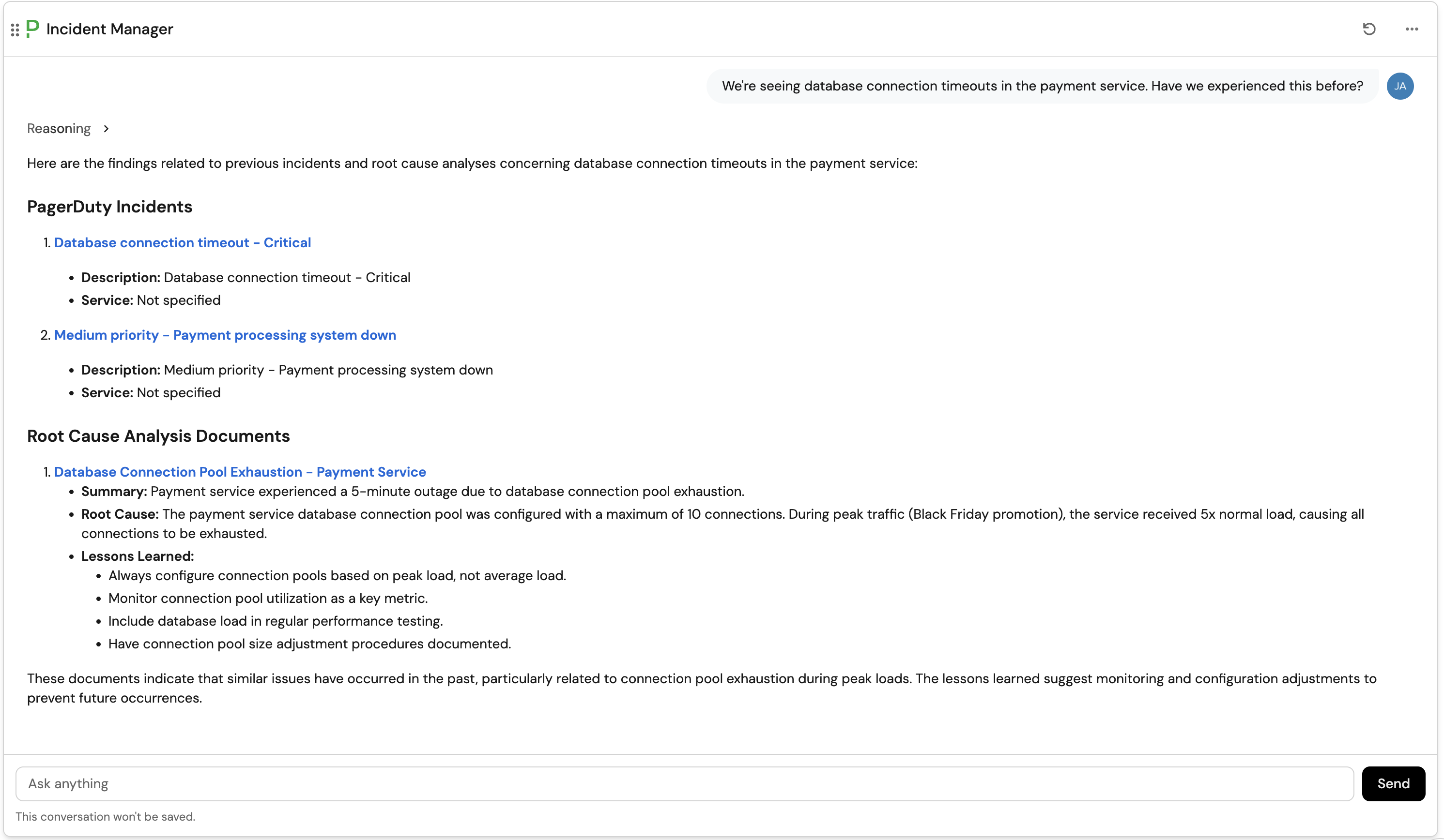 Expected response: The agent should reference the RCA document we created and provide details about the previous database connection pool exhaustion incident, including the resolution steps and preventive measures.