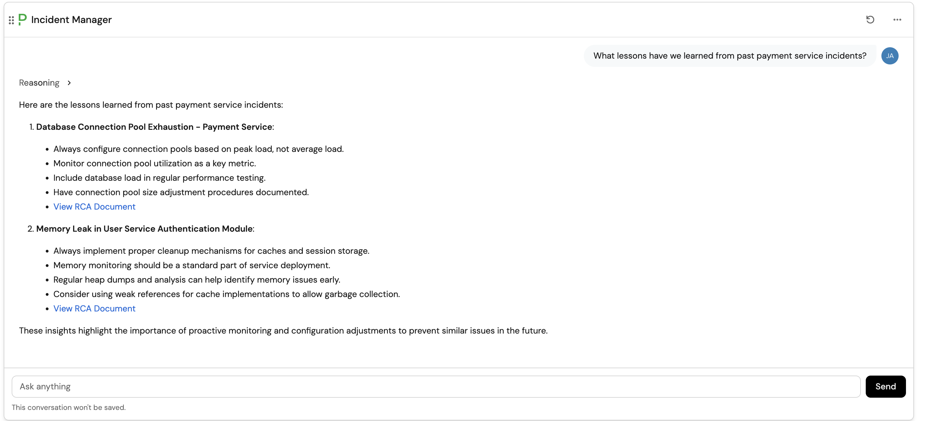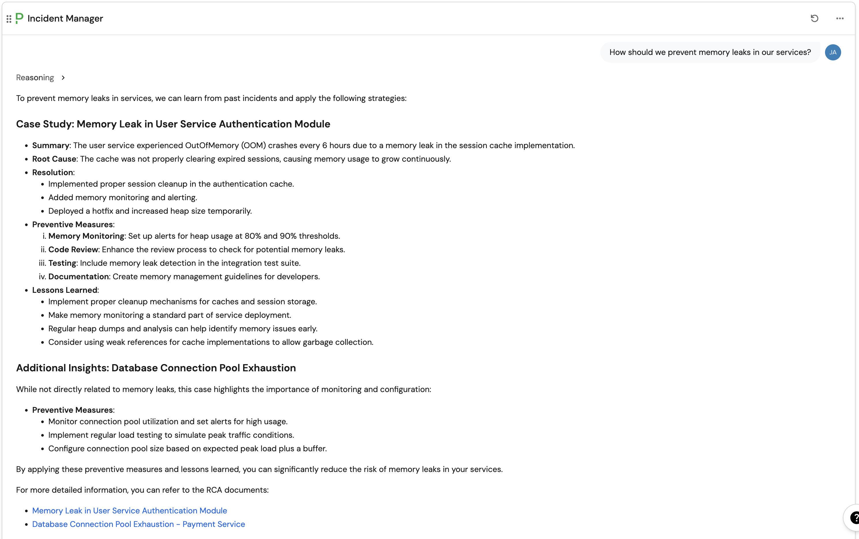 For this guide, we will leverage on the Incident Manager AI agent by adding Root Cause Analysis (RCA) documents to enable it to reference past incidents and their resolutions when answering questions.