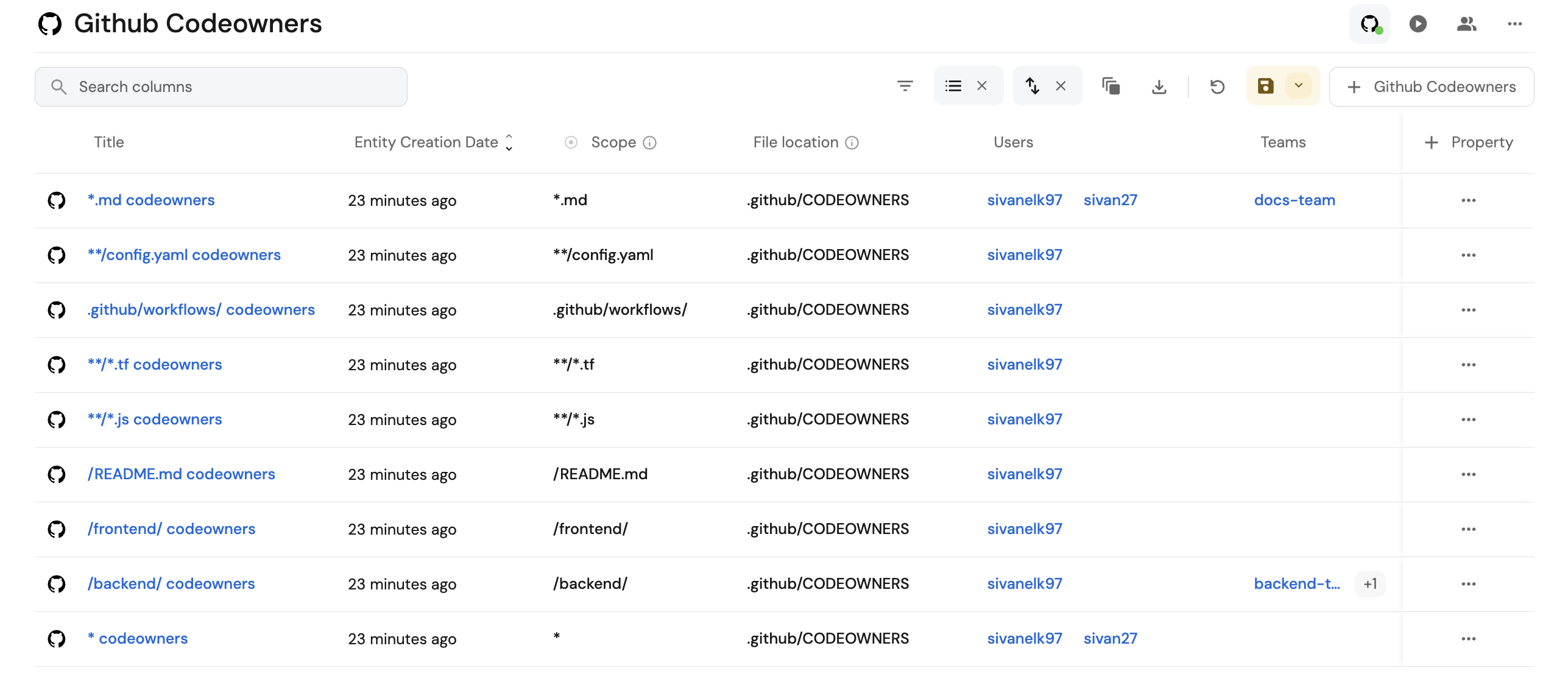 The software catalog Codeowners page should display the corresponding Codeowners entities: