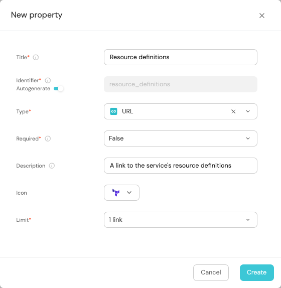 To enable tracking of cloud resource definitions in Port, we'll add a new URL property to the existing Repository blueprint.