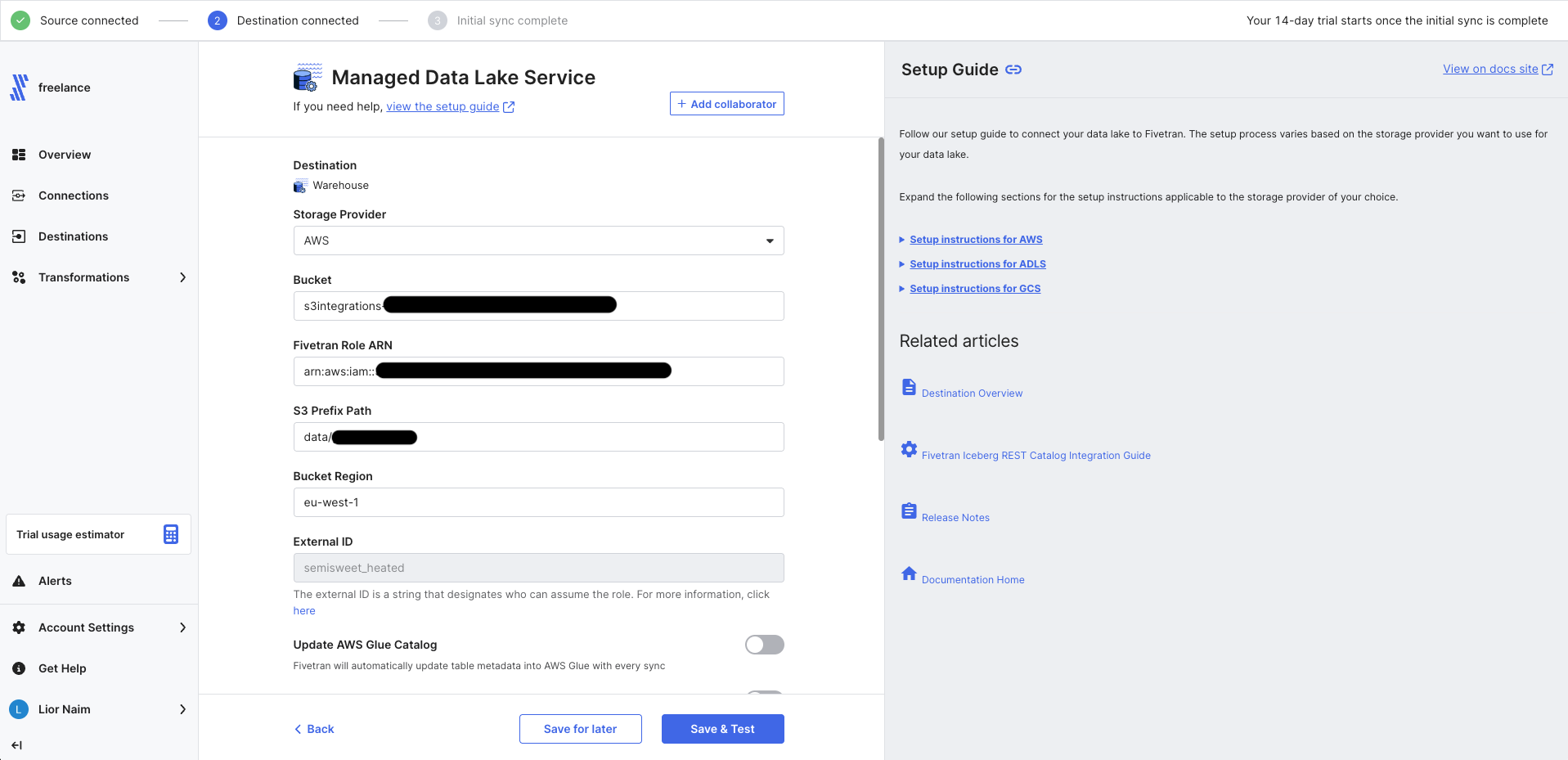 S3 Data Lakeoption under Fivetran Managed Data Lake Service, and clickset up. -