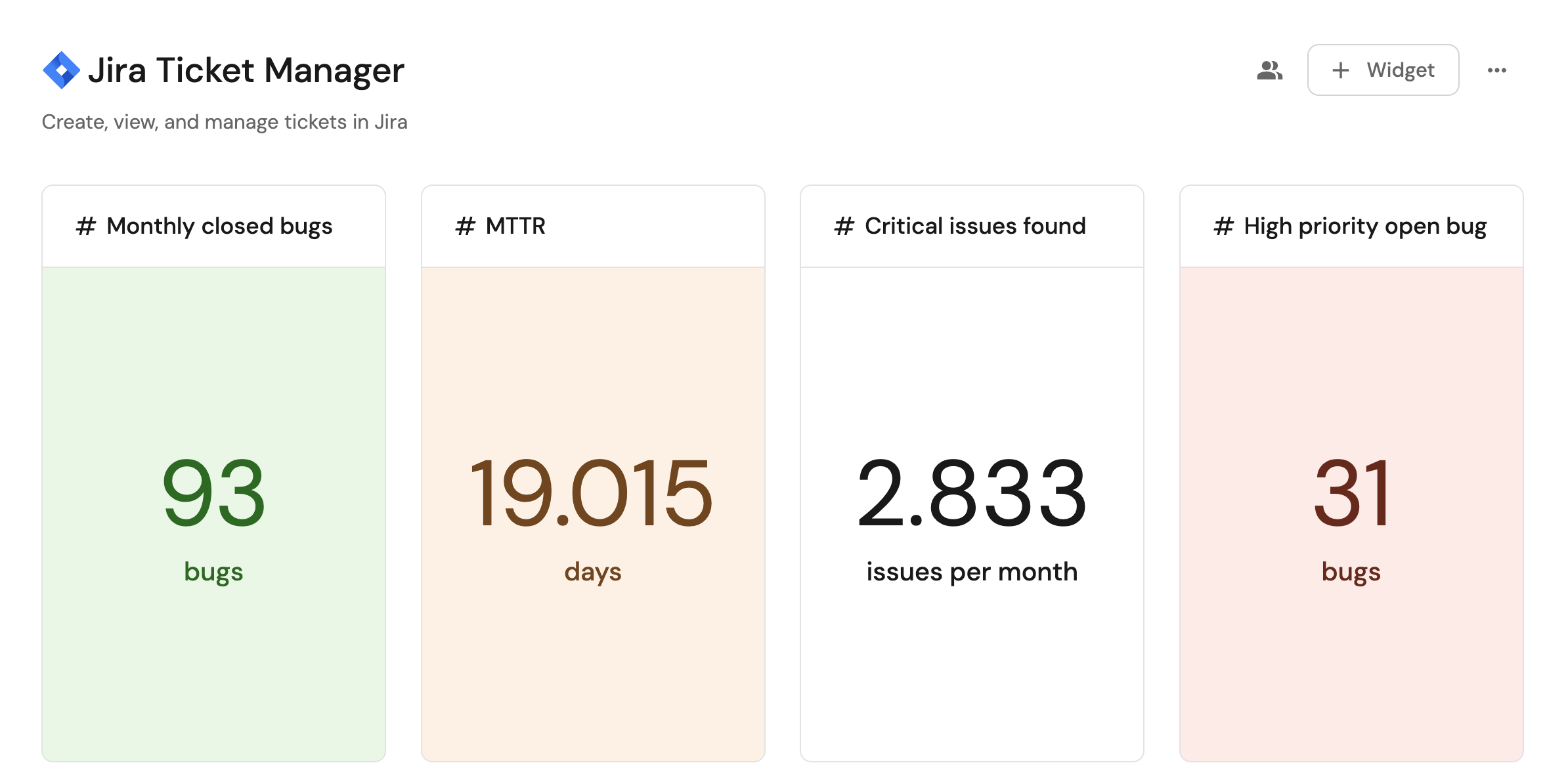 With issues ingested and actions configured, the next step is building a dashboard to monitor Jira data directly in Port. We can visualize key metrics using the following widgets: ticket status distribution, delivery timelines, and high-priority bug tracking. These customizable widgets provide insights into your Jira issues, helping you manage and prioritize effectively.