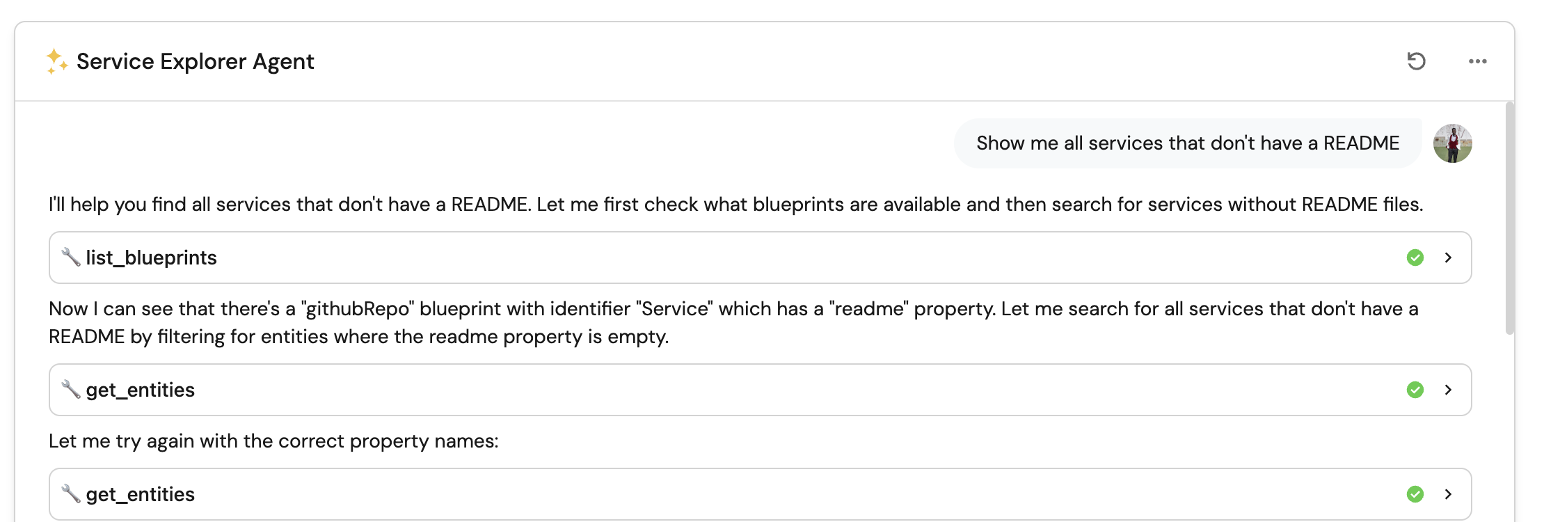 ^(list|get|search|track|describe)_.*pattern allows the agent to access and analyze related entities across your entire software catalog, including services, repositories, teams, users, incidents, deployments, monitoring data, and more. This automatic discovery means you don't need to manually configure which blueprints the agent can access - it intelligently finds and uses relevant data to answer questions about your services. -