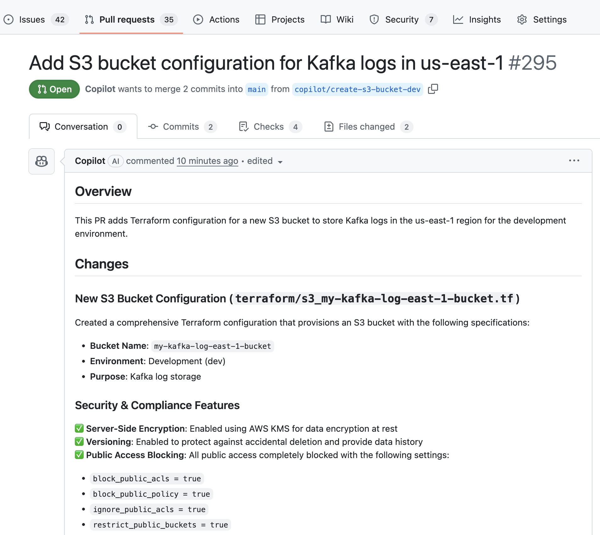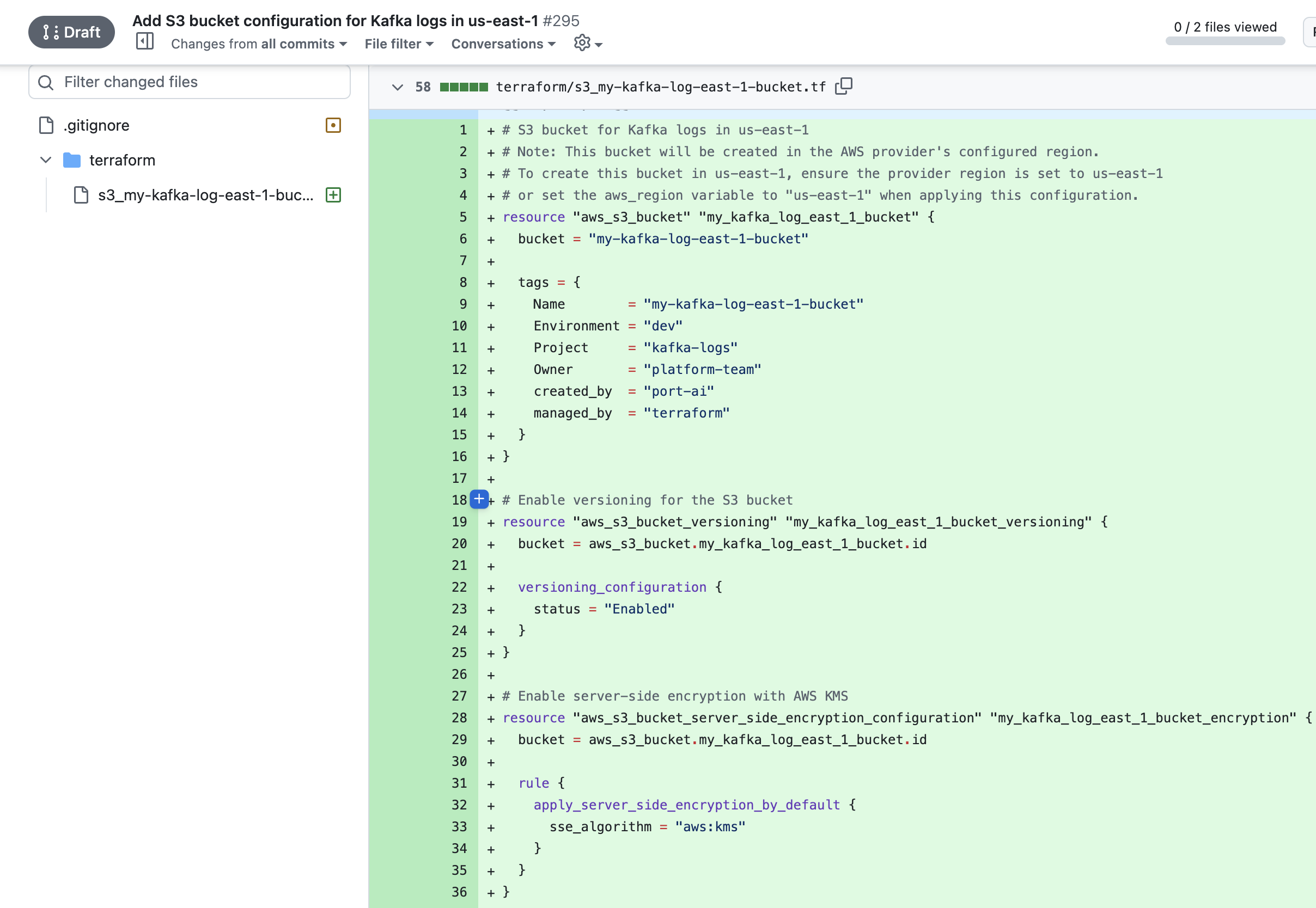 promptfield with your resource requirements, for example:Create an S3 bucket named "my-kafka-log-east-1-bucket" for development environment.