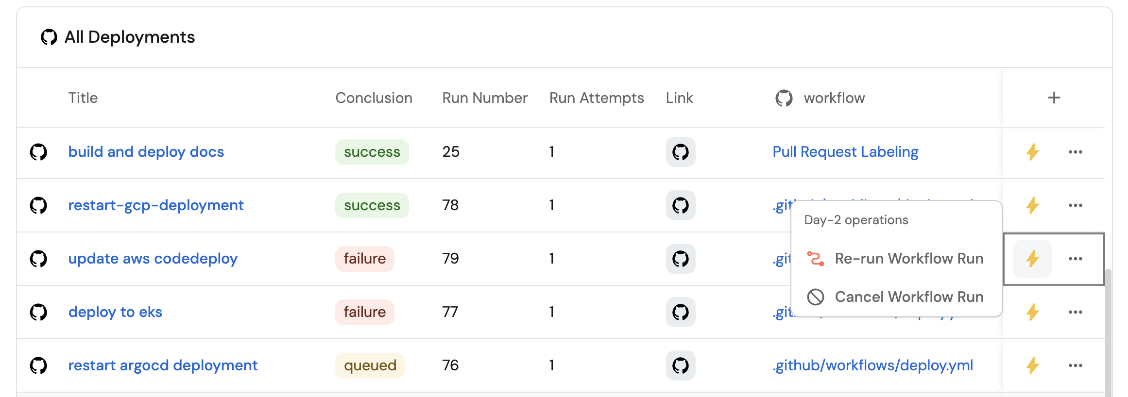 - Set up self-service actions to manage deployments (trigger, retry, and cancel).