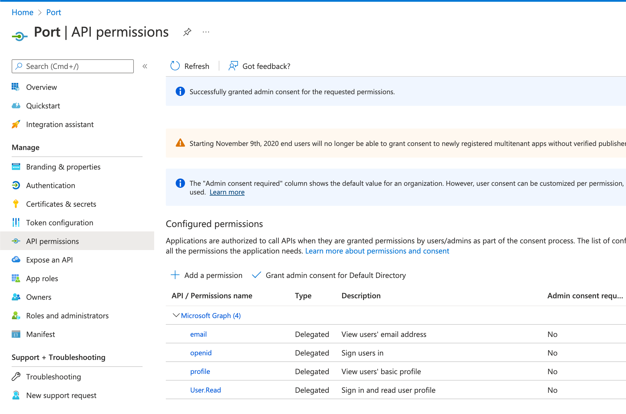 Grant admin consent: when users from your organization will first log in, they will be prompted to confirm the permissions specified here. You can click theGrant admin consent for Default Directoryto automatically approve their permissions.