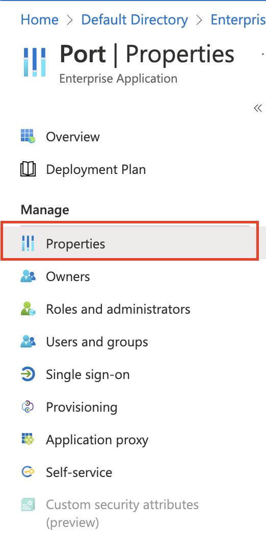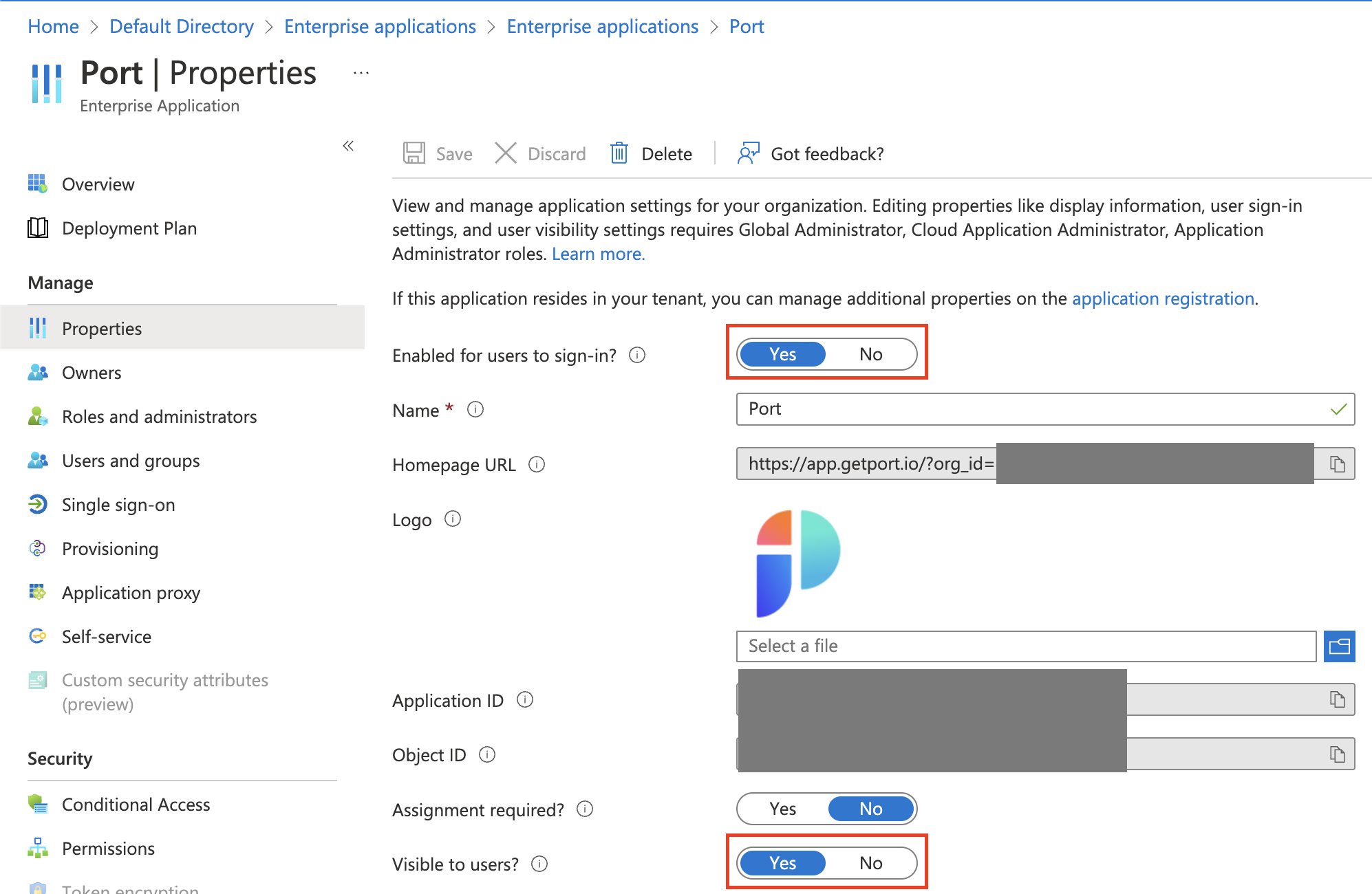 Assignment required?flag is set toNo, meaning any user with the Homepage URL to the Port app can access it, even if the app isn't directly assigned to them. Changing the flag toYesmeans only users and groups the app is directly assigned to can use and access it.